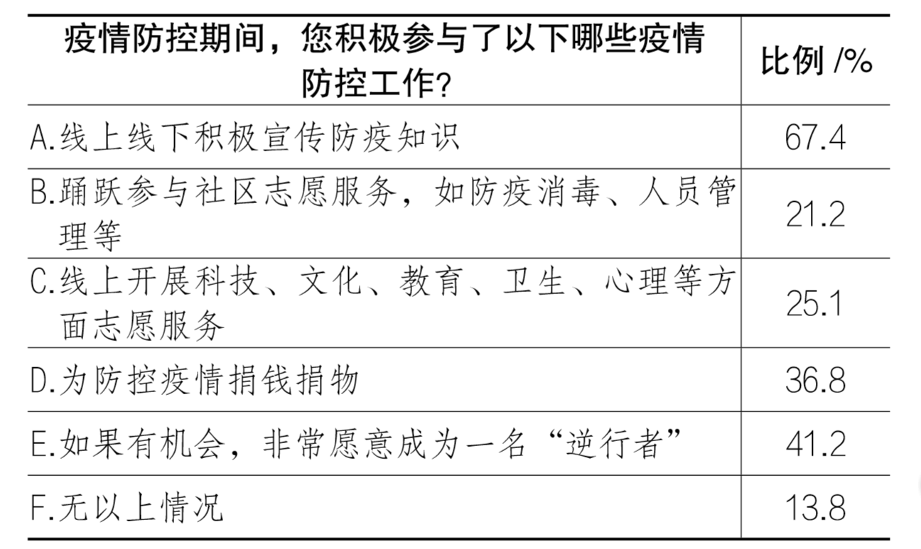 公德是公民素养培育的重要指向,也是影响社会治理效能的重要因素。调查发现,一些大学生未积极配合疫情防控工作,出现聚会聚餐、瞒报行程、发布不实疫情信息、擅自提前返校等失范行为。西北农林科技大学、贵州民族大学、江西理工大学等高校对私自提前返校的学生给予了严肃的纪律处分。13.8%的大学生未主动参与疫情防控工作,这表明一些大学生在重大突发公共卫生疫情面前社会参与和建构意识还不够。这些在应对重大疫情中暴露出来的问题,是大学生公德观念薄弱的鲜明体现,一方面扰乱了协同战“疫”的秩序,影响党的领导和制度优势转化为社会治理效能;另一方面不利于大学生公民素养培育,也说明高校人才培养实效亟待提升。