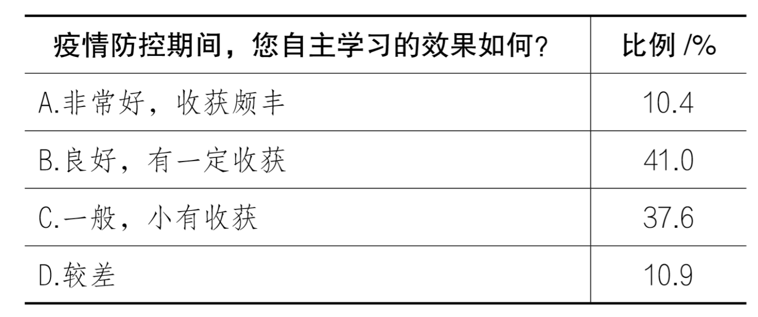 (3)学习方式和内容更加多元,自主学习能力有待提高。在疫情防控期间,56.3%的大学生每天可以保证2小时以上的学习时间,但仍有16.4%的大学生每天学习时间在1小时以下。关于学习方式,网课、直播等在线学习成为最主要学习方式,占比80.6%。在学习内容方面,大学生功利化趋向明显,专业知识与就业、升学考试内容占比为68.4%和30.0%,人文社科和科学技术等通识知识学习占比仅为37.4%。从学习效果自我评价看,10.9%的大学生认为自主学习效果不好,良好以上占比仅为51.4%,这一结果与部分大学生学习时间不足、学习内容结构失衡相互印证(见表4)。
