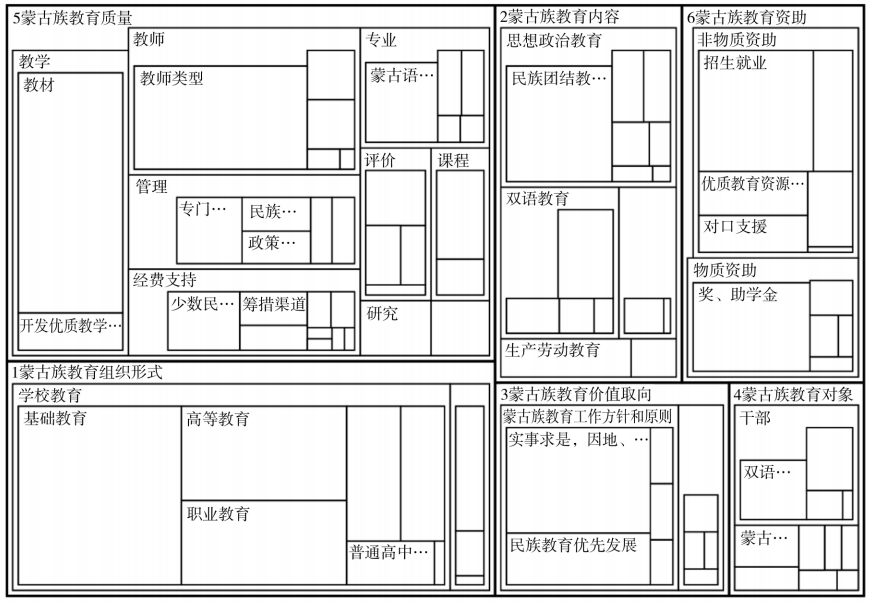 2.研究方法——批评话语分析法。批评话语分析法(Critical Discourse Analysis Method)兴起于20世纪70年代末80年代初,它将话语作为构成社会实践活动的符号成分(semiotic elements of social practice),是一门旨在研究和解释社会问题的跨学科语言研究。本研究采用批评话语分析法,对政策文本内容深度话语分析,揭示文本背后所体现的语言、权力与意识形态之间的关系[5]。将1947年至今内蒙古民族教育相关政策文本建立一套编码系统,以时间为线索对内蒙古民族教育公共政策中“教育价值取向”“教育质量”“教育内容”“教育组织形式”“教育对象”“教育资助”等六个维度进行深入研究,梳理出各个维度在发展历程中的特征与变化,在社会历史语境下对内蒙古民族教育政策的演变进行内容、结构、意义等方面的解读。