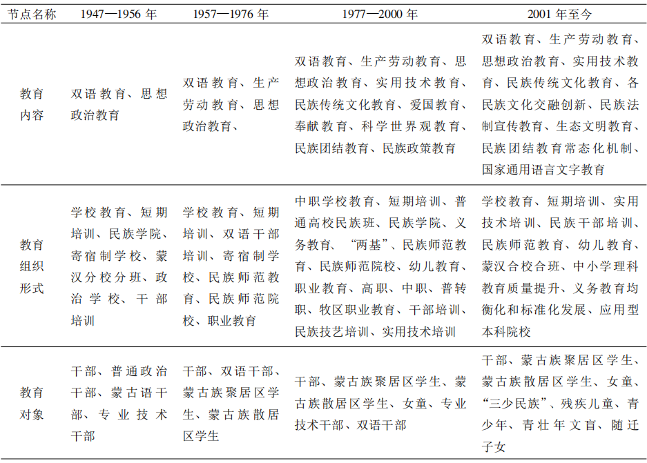 通过对节点结构变化的分析,可以窥见文本内容的不断更迭。研究者可以利用这些政策文本中信息的变换把握政策制定者的意图和政策环境的变化。受经济、社会、文化等外部环境变化的影响,政策目标与政策内容会有巨大的变化。通过对政策文本资料的详细编码与客观分析,将内蒙古民族教育政策(1947年以来)的编码要素划分为1947-1956 年、1957-1976年、1977-2000年、2001年至今四个阶段。由于选择性编码形成的六个主要树节点的层次结构大致相同,为了进一步细致研究其内部结构的变化,本研究对一级子节点、二级子节点乃至更深入的概念进行变迁比较。四个阶段内蒙古民族教育政策文本编码变迁的过程,具体见表2。以“教育内容”为例,在第一阶段(1947-1956 年),该节点只有两个一级子节点即“双语教育”和“思想政治教育”,第二阶段(1957-1976年)衍生出“生产劳动教育”一级子节点;第三阶段(1977-2000年)又增加了“实用技术教育”“民族传统文化教育”两个一级子节点;第四阶段(2001年至今)一级子节点不再变化。另外,一级子节点之下也有相对应的节点层次且随着时间的变迁,层次内容逐渐丰富,如“短期培训”一级子节点,第一阶段有二级子节点“干部培训”;第二阶段在“干部培训”子节点下衍生出 “双语干部培训” 下位节点;第三阶段,增加了“民族工艺培训”和“实用技术培训”两个二级子节点;第四阶段,“校长培训”“民族干部培训班”“政治训练班”“牧业实用技术”“民族职业培训班”使二级节点的内容更加丰富。需要注意的是,在内蒙古民族教育政策发展变迁历程中,一些节点的结构虽没有发生太大的变化,但其内涵却在不断地丰富和延伸。