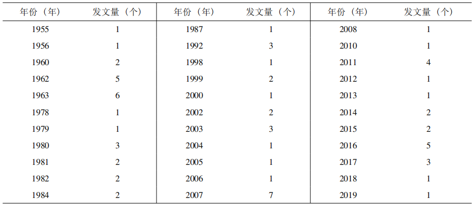 2.政策文本的历年数量分布。文本制发数量能够反映出政策制定者在某一时间点对该主题相关问题的关注程度和政策文本的适时性。内蒙古自治区成立以来,其民族教育政策文件制发数量经历了高低起伏的变化,分析政策文本的历年数量分布,能够帮助我们更直观了解内蒙古民族教育政策教育的关注重点及演进历程,具体见表1。