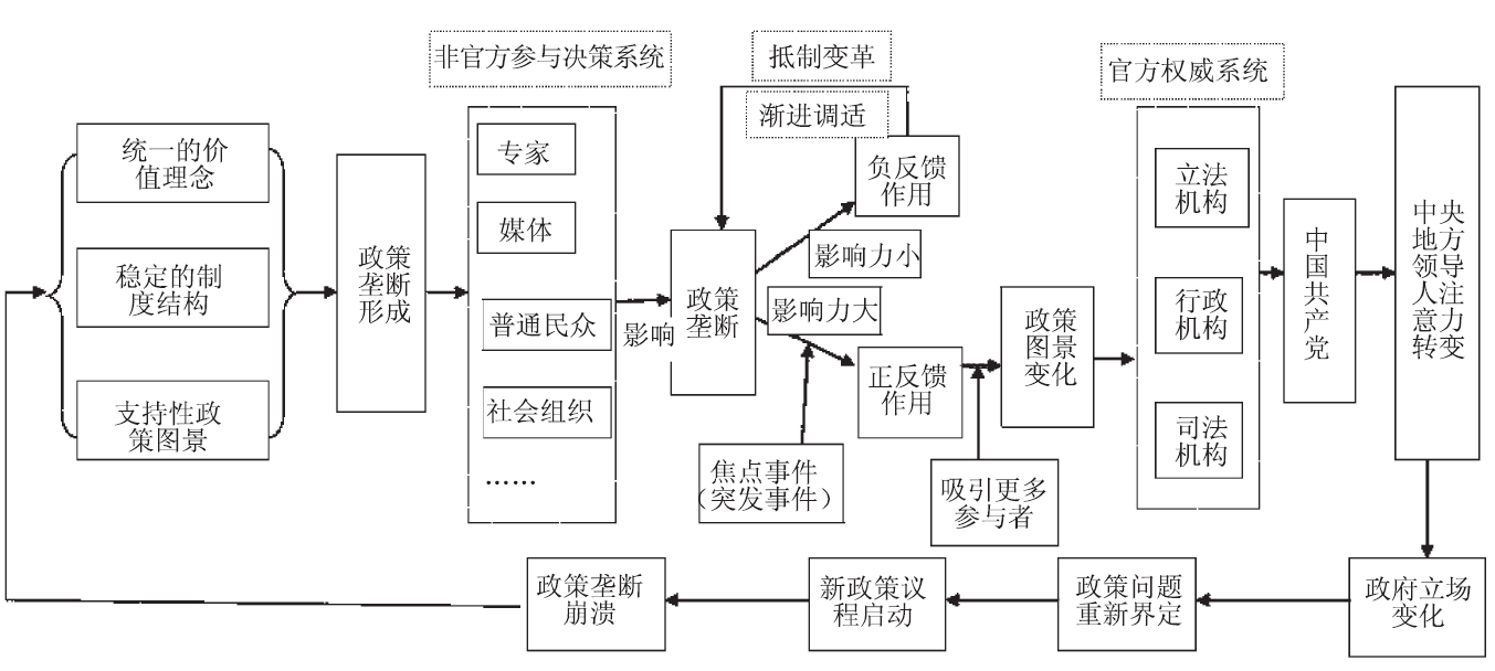 正反馈和负反馈机制是间断平衡理论的重要反馈机制,正因为正反馈和负反馈的作用机理,政策的间断和平衡、稳定和变迁才得以实现。负反馈作用与政策稳定相连,巩固政策垄断,促进系统均衡。它包括自我纠正和自我平衡两种机制。自我纠正机制通过维持现状,抵制变革实现政策稳定。正如鲍姆加特纳和琼斯所阐述的负反馈机制的过程在于它抵消了环境中的一切变化而不是强化这种变化。[8]自我平衡机制不反对变革,但提倡渐进主义模式诱发公共政策的稳定。正反馈是政策变迁的机制,它是强化而不是抵消一种变革趋势,是自我增加机制。非官方参与决策系统产生了新的价值理念,要求现有政策变革,加上突发性事件助推,政策窗口被打开,不仅吸引更多新的参与者进入,而且引起官方权威系统,尤其是高层官方权威系统的高度关注。随之,官方立场发生变化,公共问题进入议事日程,政策问题重新界定,新政策议程启动,政策垄断和平衡被打破。根据新的价值理念和新的支持性政策图景,制度结构的均衡状态被打破,新的政策垄断形成。如中国早在20世纪90年代末,就有学者、媒介、社会组织开始关注唯经济发展带来的问题,呼吁科学发展,可持续发展,注重经济发展的同时应该关注让人的全面发展和环境保护。面对非官方权威系统的压力,政策做出过渐进调试,但根本的价值理念、政策范式和政策图景未发生转向。随着问题越来越突出,最后爆发“非典”事件和“孙志刚”事件,这两个突发性事件引起高层官方决策系统的高度关注,加上新的领导集体上台,助推新的政策范式和政策图景转向,显示出强大的正反馈作用,最后中央提出“科学发展观”“以人为本”“绿色GDP”等一系列新的政策图景。许多具体政策在新的政策范式和新的政策图景下,做出了许多具体变革,推动了政策变迁的发生。