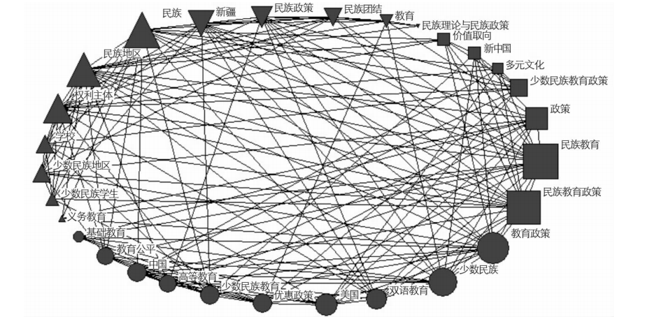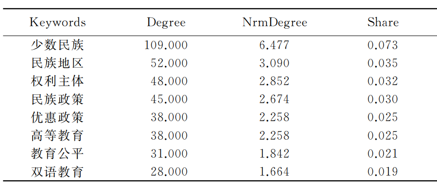 由表5可知,“少数民族”、“民族地区”、“权利主体”、“民族政策”、“优惠政策”、“高等教育”、“教育公平”和“双语教育”等关键词的度数中心度值较高,说明在该研究领域中,民族地区教育政策研究、民族教育政策与立法研究、民族教育优惠政策与高等教育阶段相关政策研究占主要地位。同时,通过比较表3和表5可以看出,虽然词频排序与度数中心度排序不完全一致,但高频关键词往往度数中心度也比较高,二者存在一致性,说明在民族教育政策研究领域,高频关键词和关键词中心度对研究热点的反映程度较为可信。
