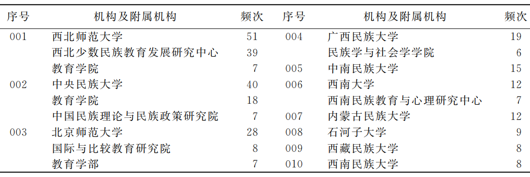 机构发文量可在一定程度上代表以机构为单位的凝聚子群在特定领域的研究实力及贡献。运用SATI对EndNote文献格式原始数据中的机构字段进行频次统计,并绘制研究机构发文量统计表(如表2)。由表2可见,高等院校是民族教育政策研究领域成果较多且影响力较高的主要活跃机构,尤其是师范院校和民族院校。综合考察研究机构与作者的共现情况,可以判定民族教育政策研究领域已基本建构出两个核心学术研究网络,分别以西北师范大学和中央民族大学为依托。其中,西北师范大学总发文量为51篇,其中西北少数民族教育发展研究中心发文39篇,集聚王鉴、滕星、张善鑫、张学强等核心作者;中央民族大学总发文量为40篇,其中教育学院发文18篇,集聚严庆、吴政富、徐杰舜等核心作者。但进一步分析发现,各个研究机构之间的合作渠道尚未打通、研究合力尚未形成,各机构独立研究是基本常态。