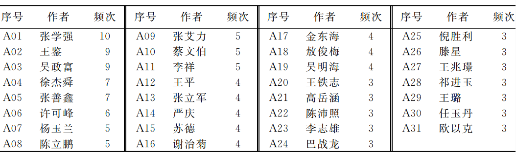 。运用该方程可确定某研究领域的核心作者,以及在一定程度上描述核心作者与全体作者之间的定量关系。在该方程中,N表示发文量的临界最大值,nmax是指成果最多研究者的发文数量。当研究者在某领域发文量大于N时,则可视其属于该领域的核心作者群。在民族教育政策研究领域中,发表文章最多的学者为张学强,共发表10篇文章。因此,将nmax=10代入到核心知识生产者分布方程中,计算得出临界值N=2.368,向上取整后确定临界值为3。运用SATI提取EndNote文献格式原始数据中的作者字段,并进行统计频次,截取发文量在3篇及以上的作者信息,绘制核心作者发文量统计表(如表1)。由表1可知,共计31位作者组成了民族教育政策研究领域的核心作者群,其中研究成果被引用的频次大于50次的作者有11位。王鉴在该领域公开发表9篇学术论文,被引354次,滕星在该领域发文3篇被引268次,王铁志、张善鑫、陈立鹏、严庆、敖俊梅、张学强、吴政富、徐杰舜、许可峰的文章被引频次均大于50次。发文量和被引频次足以证明以上作者在民族教育政策研究领域中具有相当学术影响力,发表的相关文献具有重要参考价值。