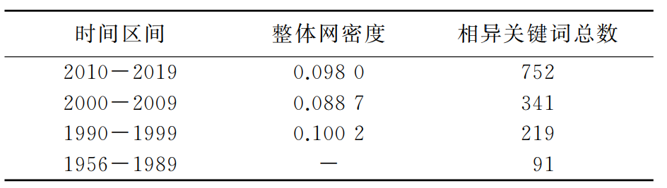 坚持“结构主义”视角的社会学家倡导“社会结构”影响“能动作用”,即社会网络整体会表现出某些特定的结构,而这些结构对其中的行动者产生影响[4]。整体网的密度就是反应其结构的紧密程度的重要指标,密度值越大,表明网络中的个体之间的相互联系越为紧密,整体网对其中每个个体的影响程度也就越大。关键词之间没有明显的方向指向,因此关键词网络是一个无向关系网,假定其中有m个关键词、n对实际关联关系,此时网络中包含的关系总数在理论上的极大值应为m(m-1)/2,关键词整体网密度等于实际关联关系数除以理论关系最大值,即n/m(m-1)/2。将从SATI软件中得出的关键词共现网络矩阵放置于社会网络分析软件UCINET中,用以计算关键词整体网的密度,具体结果如表4。