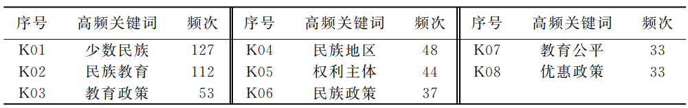 (D表示高频词与低频词的临界值,n表示相异词的总数)[3],可确定民族教育政策研究文献中1041个独立关键词的高频与低频的临界阈值为33,即出现频次为33次及以上的关键词可被视作高频关键词(如表3)。“少数民族”、“民族教育”、“教育政策”、“民族地区”、“权利主体”、“民族政策”、“教育公平”和“优惠政策”共计八个关键词的出现频次高于32次,初步反映出该领域的研究者站在推动民族地区发展和民族教育发展的宏观视域下,探讨民族教育政策相关话题,尤其关注新中国成立以来国家制定的一系列专门针对民族教育的优惠政策。同时还反映出我国民族教育政策研究与民族教育立法研究紧密联系,二者互为补充、相辅相成,共同推动民族教育研究和民族教育事业发展。