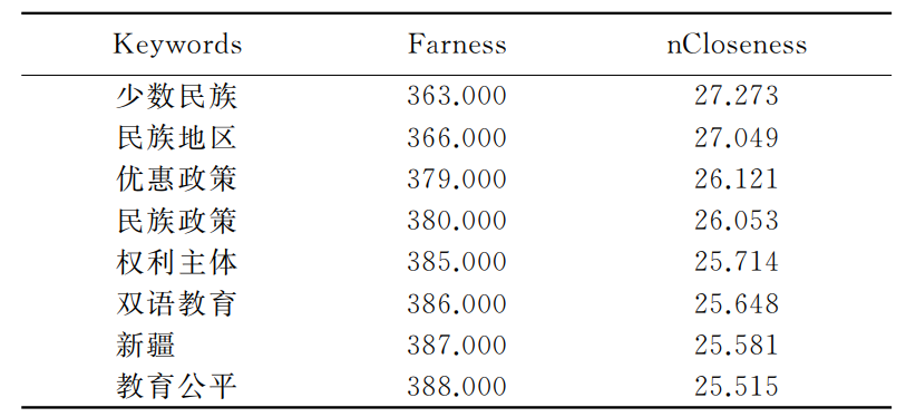 根据弗里德曼等学者的观点可知,如果社会网络中的某点与它之外所有点的距离值均非常小,则该点具有的接近中心度较高,是整体网络核心之一。同理,当某个关键词的接近中心度越小,可以证明该词处于该研究领域的中心位置。运用UCINET软件分析关键词共现网络,经计算得出接近中心度表(如表6)。前文中提到出现频次较高的“少数民族”、“民族地区”、“优惠政策”、“民族政策”、“权利主体”、“双语教育”等词位列接近中心度表的顶部,说明这些词不仅出现次数较多,且与其他关键词的联系也非常紧密,是民族教育政策研究领域中的热点。