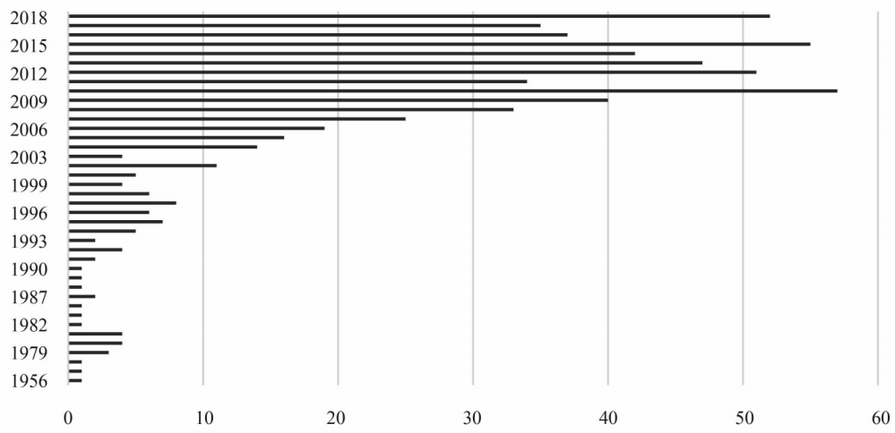 学术成果产出是衡量某研究领域发展情况的重要指标之一,对评价该领域所处的阶段,预测发展趋势和动态具有重要意义[2]。通过SATI提取EndNote文献格式原始数据中的年份字段,并进行频次统计,绘制民族教育政策研究年发文量趋势图(如图1)。