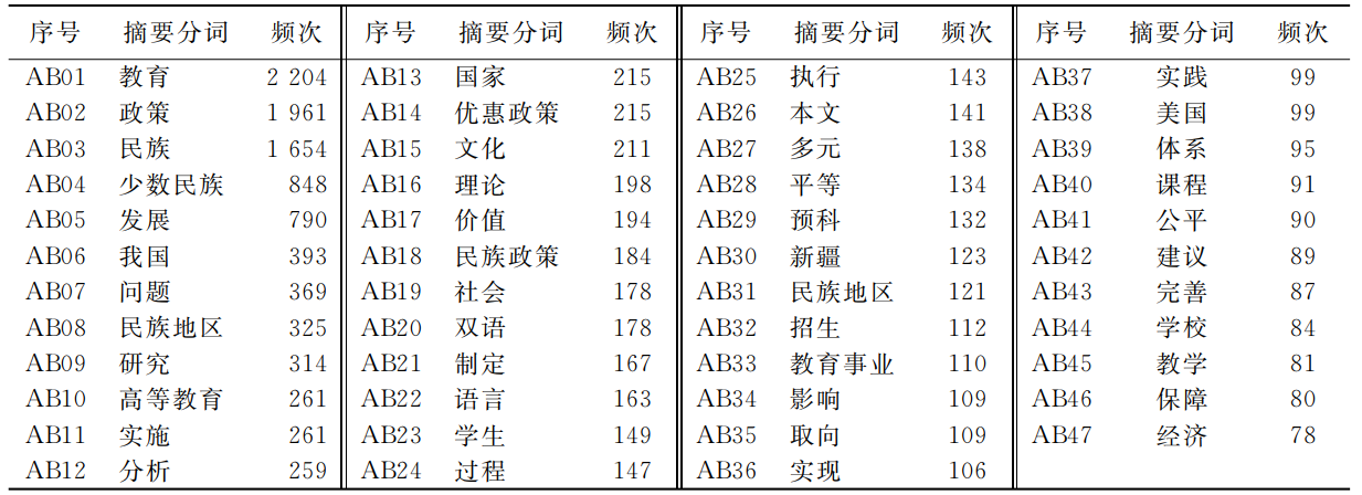 观察高频次分词可以发现,摘要中不仅包含高频关键词所提供的信息,还呈现了更多研究内容,如“问题”、“发展”、“实现”等具有目的性的词语出现,反映民族教育政策研究内容具有实践取向,旨在解决现实问题和推动民族教育发展;“价值”、“取向”、“多元”、“平等”等与价值判断相关的词语出现,反映政策价值取向是该研究领域中重要内容之一;“过程”、“制定”、“执行”、“实施”等政策相关术语出现,反映民族教育政策研究内容涉及政策制定及实施过程,但政策的“评估”未出现在高频分词之列。