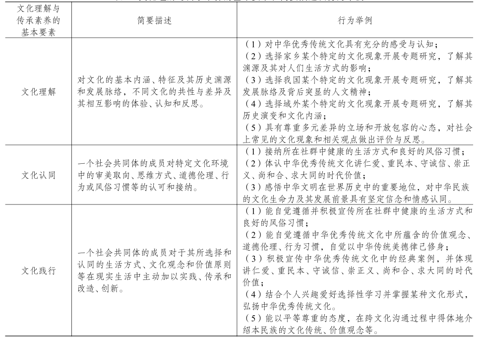 为更加清晰地呈现本研究的主要观点,表1汇总了文化理解与传承素养的基本要素和简要描述,并列举了不同要素的代表性行为表现: