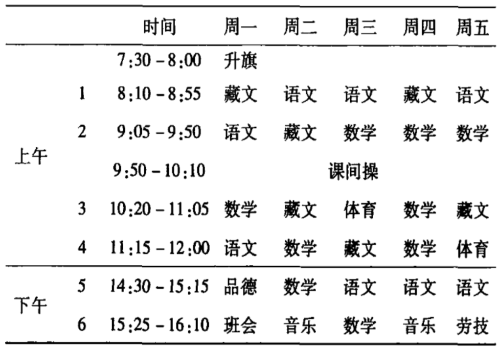 表1为长江源民族小学一年级(1)班课程表。我们可以看出,学校对时间有精确的把控,在规划时间的同时也规定了每一时段相应的教学活动,以此规范学校管理秩序,完成教学任务,确保时间的高质量使用。
