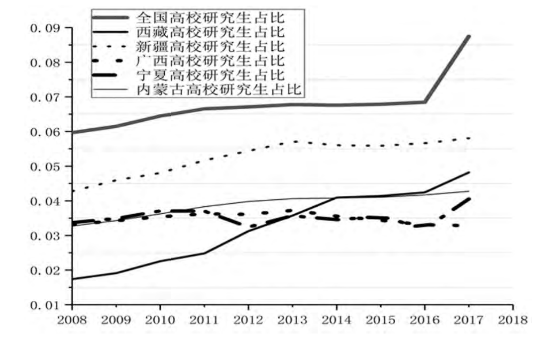 在高等教育进入大众化阶段后,研究生教育承担着高层次人才培养的重要任务。从2008—2017年,5个自治区在校生中研究生占比提升较慢,且与全国平均水平相差甚远(如图6)。
