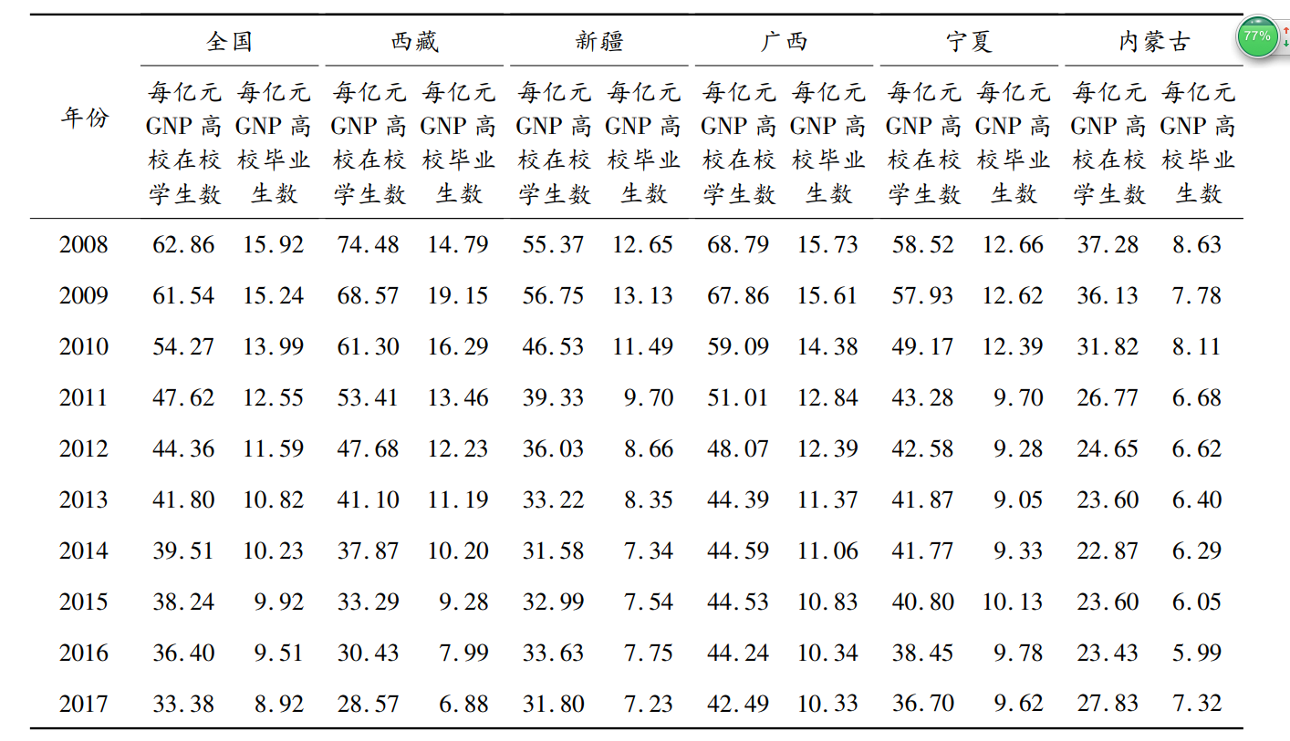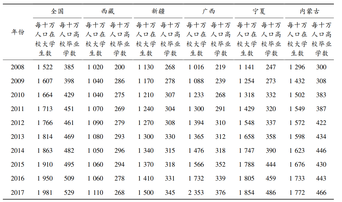 ①③表中数据根据2008—2017年《全国统计年鉴》《西藏统计年鉴》《新疆统计年鉴》《广西统计年鉴》《宁夏统计年鉴》《内蒙古统计年鉴》整理。其中2014年《西藏统计年鉴》中的高校在校生人数包括研究生,本表做了剔除,以与其他几个自治区一致,只包括本地高校普通本专科生.