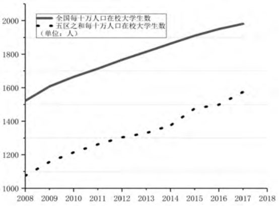 2008—2017年5个自治区高校每十万人口在校大学生数和每十万人口毕业生数与全国一样,都呈逐年递增趋势(见表1)。