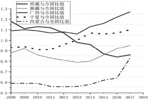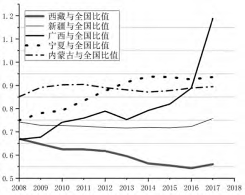 ④数据来源于2008—2017年全国和五大自治区统计年鉴以及五大自治区《国民经济和社会发展统计公报》.