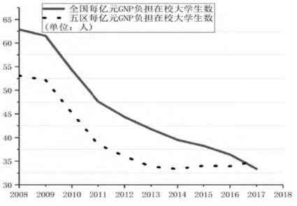 如果把5个自治区作为整体来看,其高等教育发展规模与全国平均水平的差距在逐渐缩小。如图5所示,与全国相比,2013年之后,5个自治区整体每亿元 GNP 负担高校在校生数下降速度趋于平缓,到2017年开始接近全国平均水平。