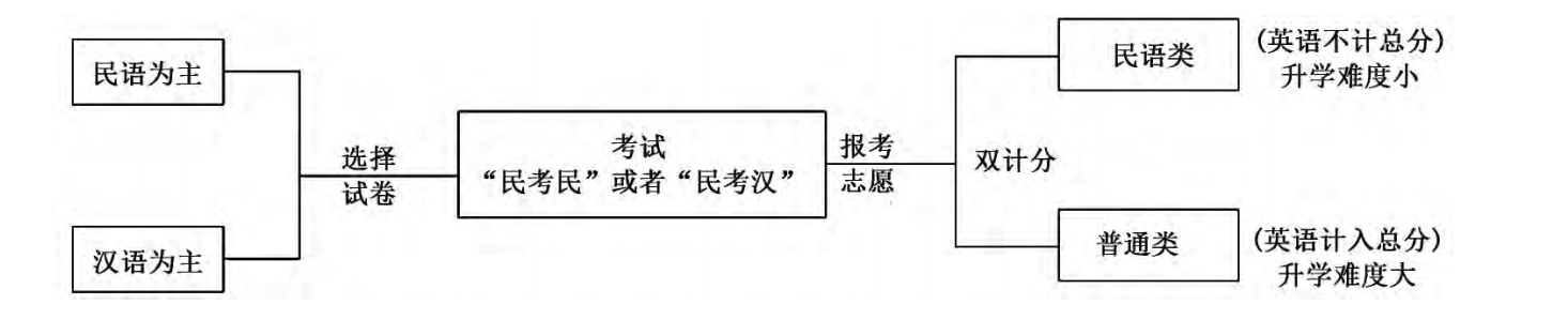 中华人民共和国成立之后,党和国家为了促进民族地区经济社会的迅速发展,采取了一系列重大举措,其中全力推进民族教育优先发展,为民族地区大量培养人才是最为重要的内容。经过近70年的不断探索和发展,我国已经建立起系统较完备的民族教育体系。在相对独立的民族教育体系内部,双语教学广泛采用的主要是“民语为主(模式一)”和“汉语为主(模式二)”两大类模式。与这两类双语教学模式相对应,少数民族学生在参加高考过程中可以根据自己所接受的双语教学模式选择相应的试卷类型(民语为主类试卷和汉语为主类试卷),选择民语为主类试卷的学生使用民族语言答卷,简称“民考民”,选择汉语为主类试卷的学生使用汉语答卷,简称“民考汉”。在当前通行的高考“3+X”考试方案中,所有科目均使用高考全国卷,在此基础上加考一门民族语文,可以形似地称之为“4+X”考试,唯一不同的是民语为主类试卷题目有民族语文的翻译,即每个题目均是双语呈现。
