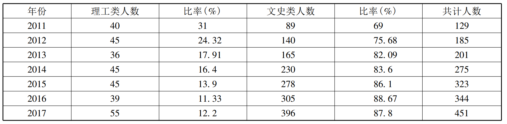 表3 甘肃省X县藏族中学文理科选择人数统计(2011—2017)