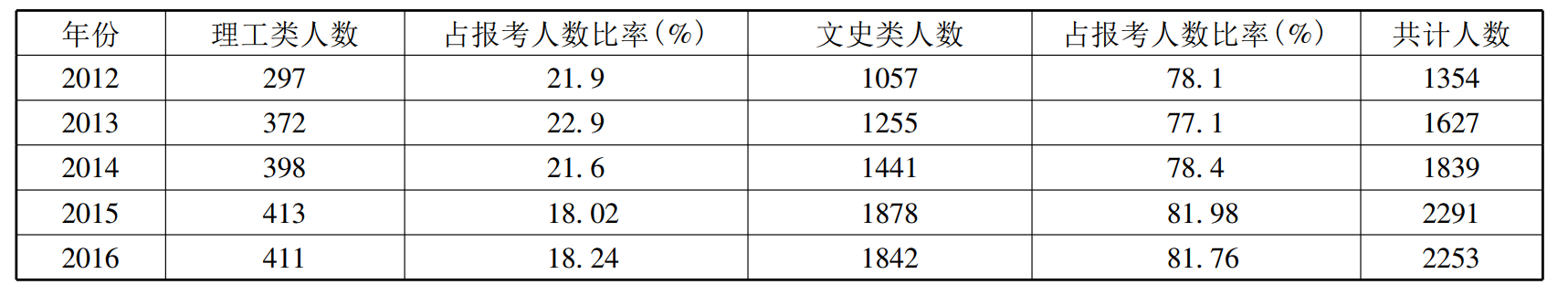受高考招生指挥棒的影响,少数民族学生报考民族院校时同样出现了报考文理科专业人数比例失衡的问题。从2012—2016年甘肃省藏族学生报考民族类院校数据来看,文史类专业的报考人数占报考总数80%左右,报考理工类专业的学生仅占报考总数的20%左右(见表2)。