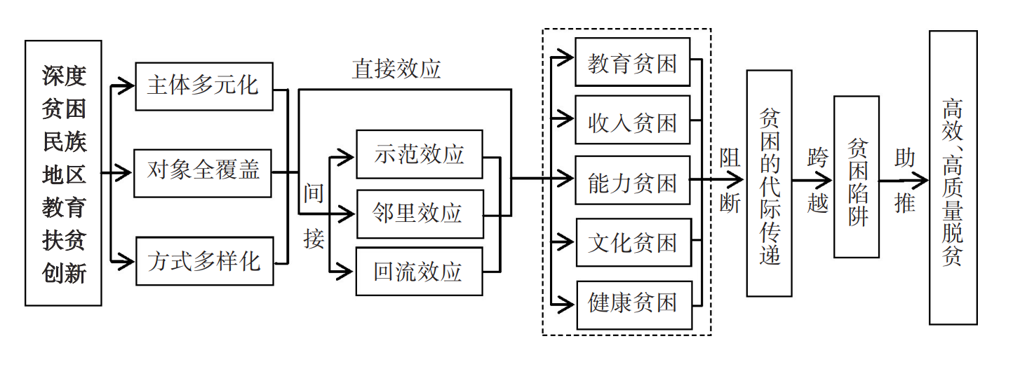 结合深度贫困民族地区和贫困人口的基本特征,通过“主体多元化、对象全覆盖、方式多样化”的教育扶贫创新,实现了学校教育、家庭教育、社会教育和自我教育的协调互补,解决了常规教育扶贫的遗留难题和贫困人口的多维贫困问题,阻断了贫困的代际传递,助推深度贫困民族地区跨越贫困陷阱。