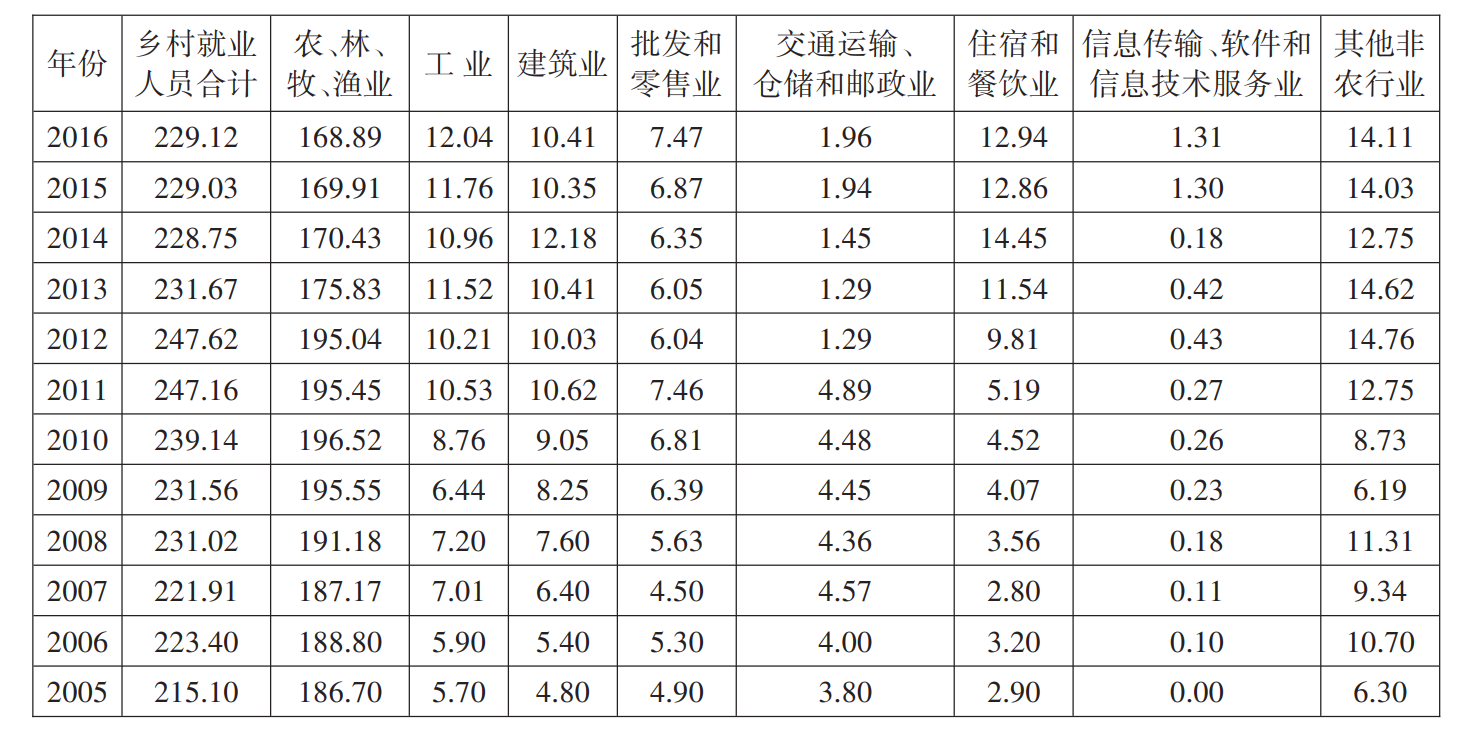 表2 凉山州按行业分乡村就业人员数(2005—2016年)(单位:万人)①