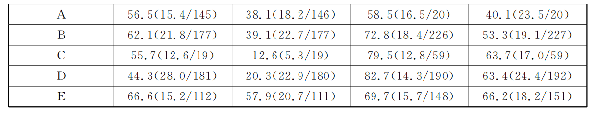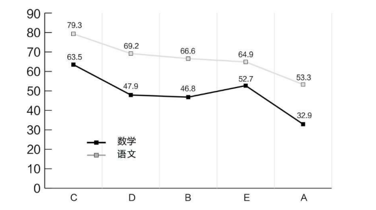 分地区来看,西藏和四省藏区中,语文成绩和数学成绩存在一致的趋势,即C的成绩最高,A的成绩最低。语文成绩从高到低的排序为C、D、B、E、A,数学成绩从高到低的排序为C、D、B、E、A(见图1)。