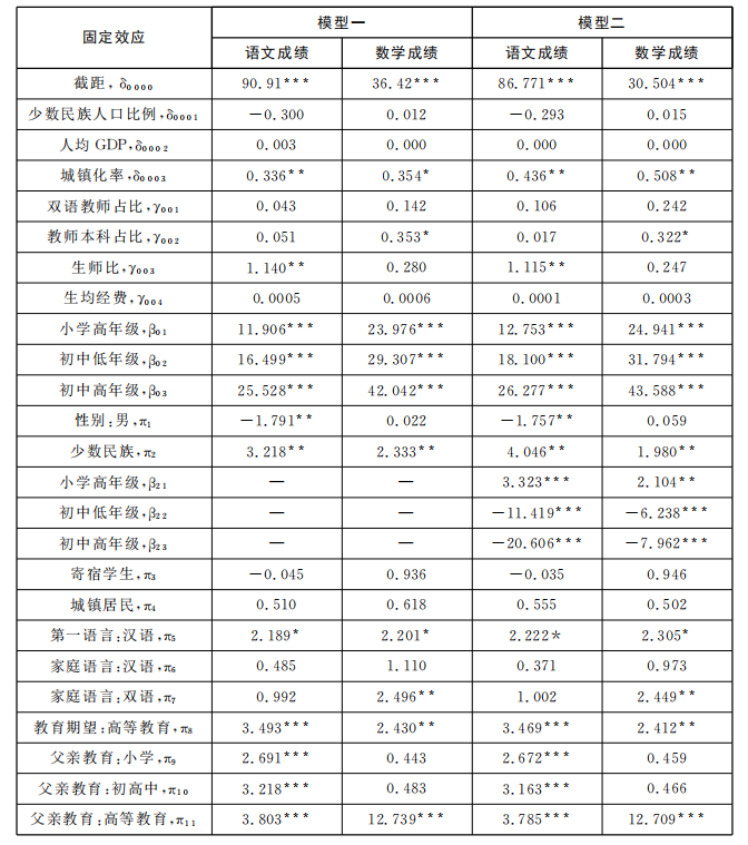 在模型一的基础上,模型二中引入了年级变量与民族变量的交互项,继续考察测试成绩的民族差异在年级间的变化趋势,