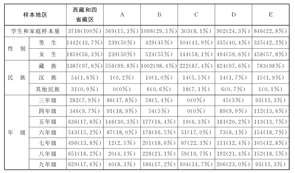 本文的数据来源于课题组2015年9月对西藏和四省藏区的调查数据。调查采取整群抽样和分层抽样相结合的方法。先确定抽样的省区,然后确定抽样的县(区),在县(区)内确定抽样的义务教育学校,再在样本学校对校长、教师和学生家庭进行问卷调查。调查的样本县(区)共9个,其中西藏2个县(区)、青海2个县(区)、四川1个县(区)、云南1个县(区)、甘肃3个县(区),共收集到义务教育学校问卷37份,学生家庭问卷3718份(样本分布见表1)。[20]考虑到低年级学生的认知水平不高,会影响问卷的信度和效度,调查的学生家庭样本为3-9年级,课题组将问卷翻译为藏语,采用的是藏汉双语版的调查问卷。