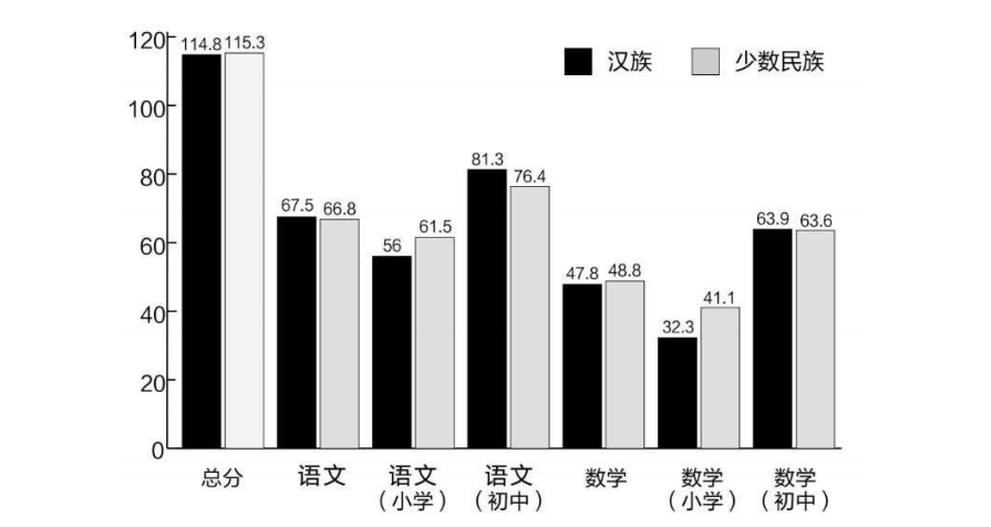 由于本次调查地区在西藏和四省藏区,藏族学生是调研的主体,占样本总量的97.6%,汉族样本占1.6%,其他民族占0.9%(包括白、回、蒙古、纳西、羌、土、撒拉、傈僳、彝等民族的学生)。分民族分析,西藏和四省藏区的少数民族的学生成绩稍高于汉族,少数民族学生的语文和数学测试总分均值为115.3分,汉族为114.8分,少数民族比汉族高0.5分。在整个义务教育阶段,汉族的语文成绩稍高于少数民族,数学成绩则是少数民族高于汉族。在小学阶段,少数民族学生的语文成绩和数学成绩都高于汉族学生;到初中阶段,汉族学生的语文和数学成绩都超过了少数民族学生(见图2)。