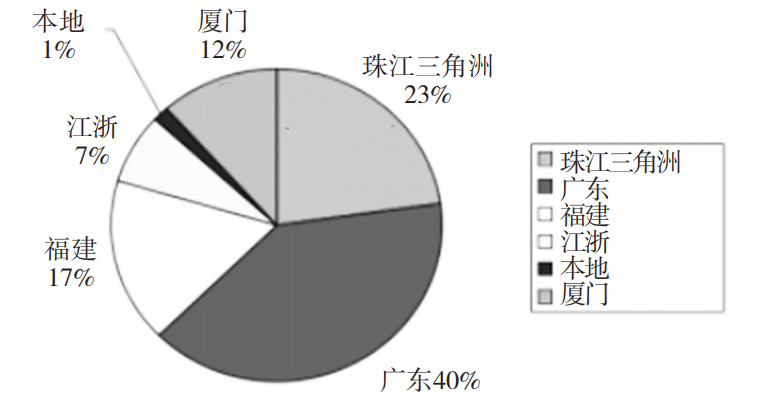 地区高校本土培养的人才大量外流。通过对贵州19所职业院校就业调查发现,贵州本土培养的人才多流向了长三角和珠三角(如图2所示)[2],造成经济贫困与人才、智力贫困的恶性循环。