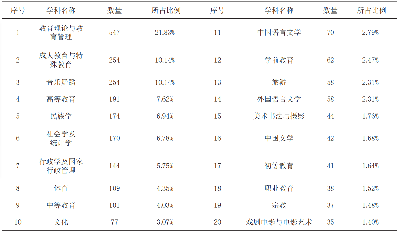对文献的学科分布统计结果显示,教育学相关学科的研究占据了近50%的比例,近十年教育人类学的文献在学科分布上呈现向教育学相关领域集中的趋势(如表5所示)。其中,教育理论与教育管理学科中的相关研究最多,职业教育和初等教育所占的比例最少,这表明近十年教育人类学研究主要集中在教育基本原理和教育问题的研究上,对初等教育和职业教育的问题和现象关注还不多。与此同时,民族学学科中关于教育人类学的研究所占比例为6.94%,这表明以民族学的视角来研究教育人类学的文献数量并不占优势,未来从民族学的方法探讨教育人类学领域的相关问题仍有相当的研究空间。为此,我们要在新的战略背景下,结合我国高等教育的实际发展情况,提出我国教育人类学学科发展的新任务。[8]