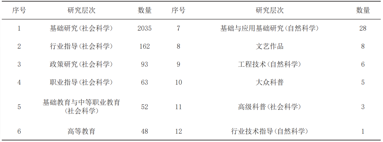 对文献的研究层次分布统计结果发现,近十年关于教育人类学的研究绝大多数属于社会科学基础研究(如表6所示)。这表明,近年来教育人类学研究主要集中在本领域的理论探索和学科成熟阶段,研究成果主要支撑了本领域的深化拓展。与此同时,一定数量的关于行业指导和政策研究的文献表明近十年教育人类学的研究为行业发展和政策研究也提供了支持,未来的教育人类学研究可能会在更多社会实际问题上提供有效的解决方案,以此促进本学科社会影响力的提升。