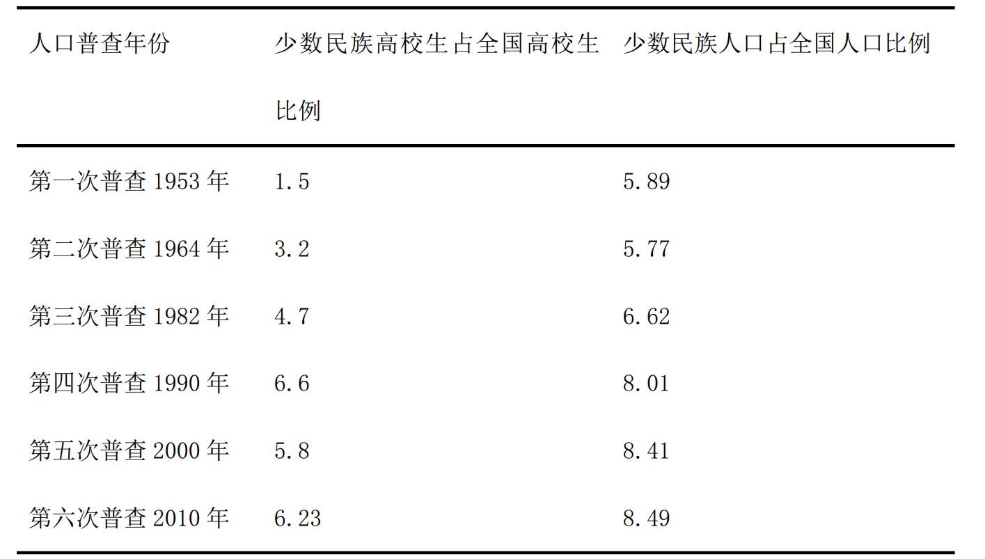 新中国成立70周年来,我国民族教育事业发展态势良好。新中国成立初期,我国教育水平低下,人口文化素质差,学龄儿童入学率只有20%左右,全国80%以上人口是文盲[1],少数民族人口中文盲半文盲率更高[2],有些民族还相当于处在原始社会末期或由原始社会向阶级社会过渡的阶段[3]。新中国成立以来共经历了六次人口普查(见表1),由表1可以发现1953-2010年间,我国少数民族高校生占全国高校生比例呈上升趋势,就1990年第四次人口普查数据,少数民族文盲、半文盲人数下降到了30.8%。[2]在2010年第六次人口普查中占全国人口比例8.49%的少数民族中,少数民族高校生占全国高校生比例达到了6.23%。2016年,全国各级各类少数民族在校生数占在校学生总数的10.3%,比2000年占在校学生总数的比例提高了2.6个百分点,截至2017年,全国各级各类学校少数民族在校学生达到2910.64万人,截至2018年底,全国各级各类学校有少数民族在校学生3067.25万人,占全国在校学生总数的10.99%,比1951年的少数民族在校生数增长了30倍[4]。在民族教育具体政策实施下,截至2017年,内地西藏初中班已累计下达招生计划5.13万人,毕业4.62万人;内地西藏高中班累计下达招生计划4.47万人,毕业3.36万人;内地西藏中职班年招生计划保持在3000人左右;内地新疆高中班累计招收10万余人;内地新疆中职班年招生计划3300人;高校少数民族预科年招生规模5万人左右;少数民族高层次骨干人才累计培养4.2万人。[5]从民族教育现行整体发展来看,确实有旧貌换新颜的变化,我国少数民族教育的积极发展离不开党和国家民族教育政策的实施,有必要对我国新中国成立70年来的民族教育政策的研究进行综述。