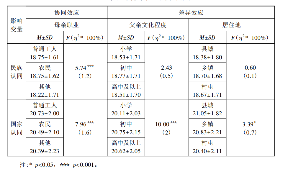 根据社会认同理论,生活在不同文化背景下的个体,会采取不同策略进行社会适应,这些策略通常包括整合、同化、分离和边缘化。其中整合策略指对主流文化和本民族文化都很适应;分离策略指对本民族文化适应,但对主流文化不适应;边缘化指是对主流文化和本民族文化都不适应。[28]对家庭环境变量进行统计分析发现,母亲职业对国家认同和民族认同具有显著的协同认同效应。效应量结果分析表明,母亲职业对国家认同的影响程度大于民族认同。以工农为职业背景的家长,对应青少年双重认同强度均大于其他职业(如经商等自由职业)背景家庭的青少年。其原因可能是,职业具有较强的社会属性,可以反映劳动者之间的社会关系。与工人和农民为职业的劳动者相比,自由职业者的社会关系往往相对不稳定,他们需在不同文化背景下进行适应,这可能导致他们在本民族文化和主流文化间采取一种边缘化的社会适应策略,无形中使他们处于“文化边缘人”状态。由于青少年与母亲存在较深的联结,他们的文化适应状态受到家长影响,导致认同度偏低,尤其是国家认同。