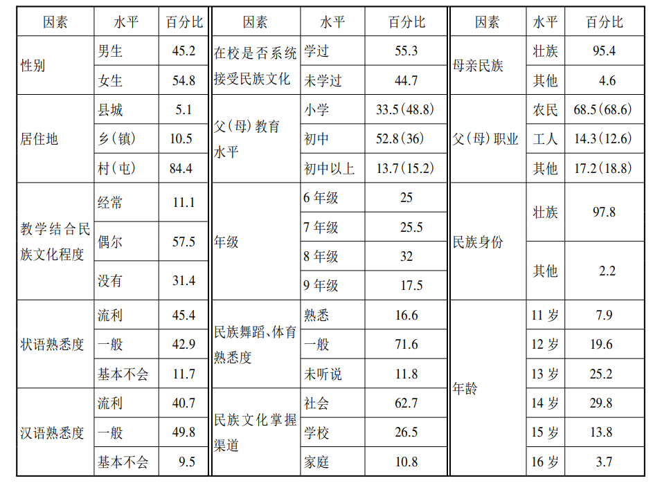 双重认同之间的协同性和差异性体现在影响双重认同的具体因素,及各因素作用于认同的机制等方面。通过编制标准化测验工具,我们不仅可以对个体的双重认同强度进行度量,还可以进一步找出双重认同的因素影响,并对各因素作用机制进行分析。以往研究发现,性别[8][9][10][11]、年级[12][13]、年龄[14]、父母的民族身份[15]、学历(教育程度)[16][17][18]、少数语言熟悉度[19]、汉语熟悉度[20]、居住地[21][22]、双语教育[23]等因素均可以影响认同,但是,以往研究者对各因素影响双重认同表现出的协同性和差异性并没有引起足够重视,对这些影响因素缺乏系统研究,对相关因素的作用机制探讨也不够深入。对影响因素作用机制分析,有利于我们更好地理解和把握民族认同、国家认同及二者关系形成和发展规律,从而为我们更好地处理双重认同关系提供实证支持。例如,何朝峰和罗之勇研究发现,性别、父母民族身份及母亲文化程度均会影响双重认同,但“是否会仫佬话”和“是否生活在仫佬族聚集区”只对民族认同有影响,对国家认同没有影响。[24]本研究拟在前人研究基础上,根据因素(或变量)来源,把双重认同的影响因素分为三类:个体特征变量(包括性别、年龄、年级、状语熟悉度、汉语熟悉度)、家庭环境变量(包括父母学历、职业、家庭居住地)和学校环境变量(课程教学结合民族文化程度、民族文化了解渠道)。同时,为了衡量各因素影响认同的强度,本文引入效应量(η2)指标,效应量越大,说明该因素影响强度越大,反之越小。