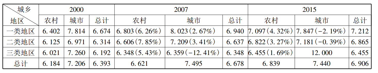 另外,通过对三类地区教育增长速度的比较发现,汉族前7年的高增长率主要出现在二类(12.27%)和三类地区(10.47%)。时至2015年,汉族和少数民族的教育增长水平差距已经大大缩小,在二类地区已经基本持平(3.37%3.31%)。相对来说,第三类地区应该是凉山地区教育发展的难点之所在。即便是在近15年来教育整体发展的趋势之下,第三类地区少数民族2015年的平均受教育年限(6.46年)也仅仅略高于其2000年的平均水平(6.37年)。