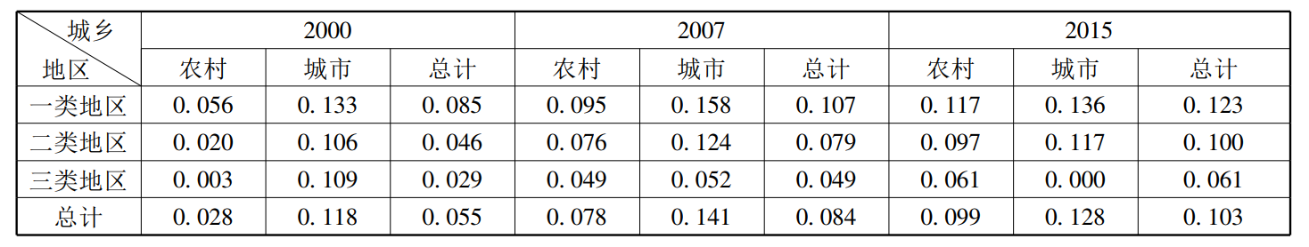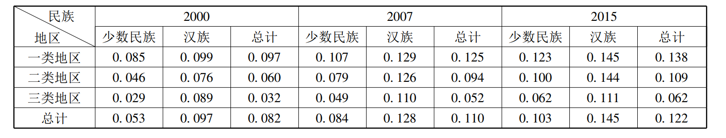 在了解凉山地区平均受教育年限差异之后,笔者基于式(2)计算出2000年、2007年和2015年凉山三类地区少数民族和汉族的教育基尼系数,用以衡量凉山地区的教育平衡。(见表3)