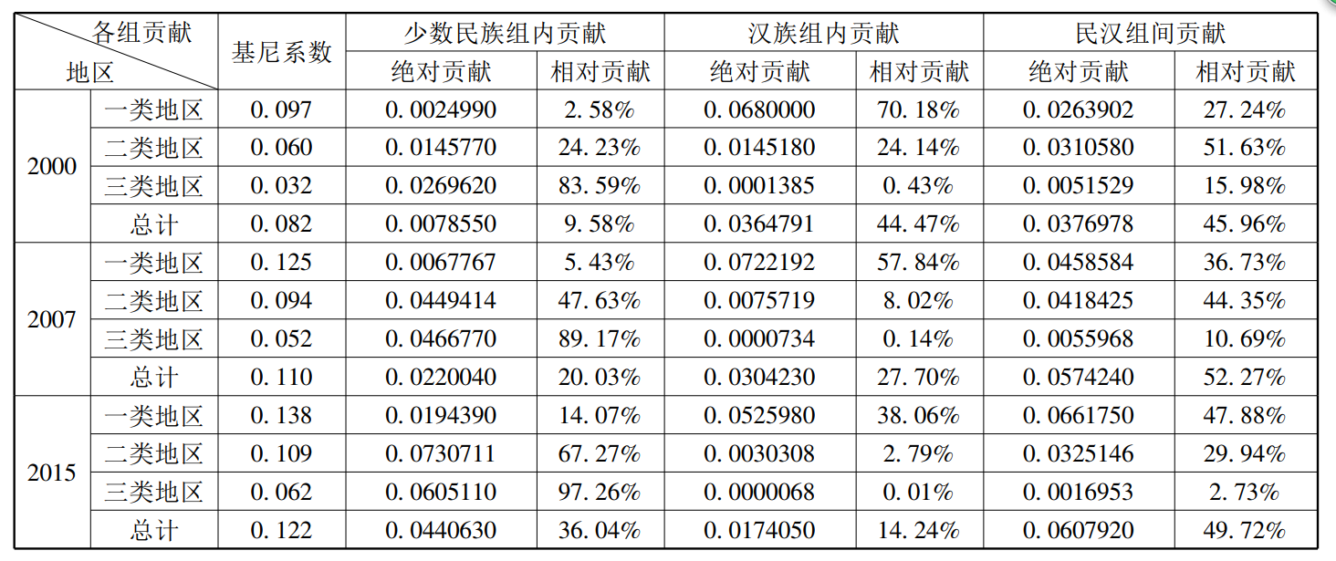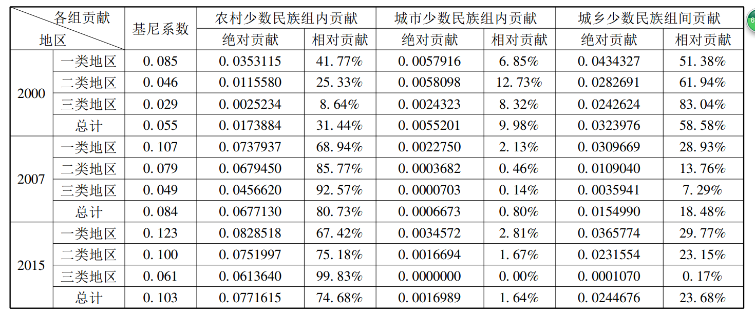 其中,q21(μ1/μ)G1/G和q22(μ2/μ)G2/G分别代表汉族和少数民族的相对贡献,GB/G代表汉族和少数民族的组间差异相对贡献。