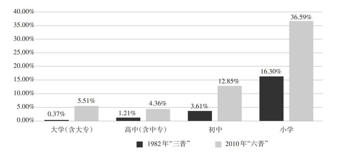 ① 据国家统计局公布的第三次全国人口普查和第六次全国人口普查的公报数据统计得出。各种受教育程度的人口包括各类学校的毕业生、肄业生和在校生。