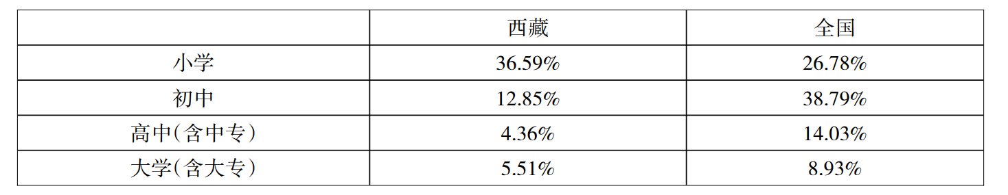 表1 2010年西藏自治区与全国受教育程度的人口比例对比③