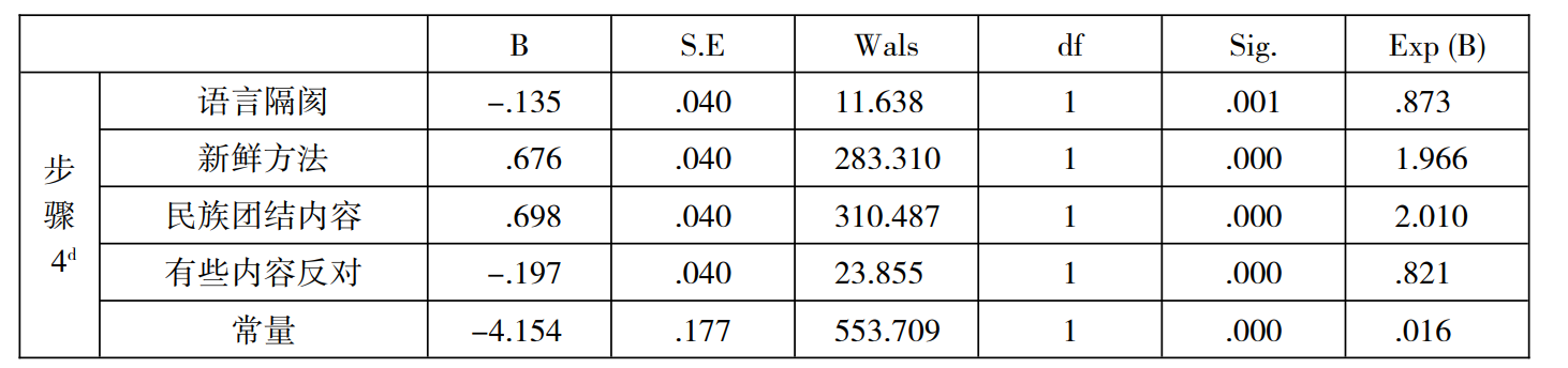 ④ 课题组在本次研究中设计并发放了四个版本的调查问卷,通过对学生问卷的具体分析,得到了当地学生对教育援藏政策满意度的影响因素的相关数据,其中问卷上的所有问题选项均采用李克特五点。当地学生对援藏教师的满意度直接通过“我对援藏老师满意”的选项结果表示,将“非常同意”“同意”“不一定”三个选项归类为“满意”,将“不同意“”非常不同意”两个选项归类为“不满意”,作为回归分析的因变量。自变量为“新鲜方法”,问卷中的问题为“援藏老师在上课时,会运用一些新的方法,如:PPT、多媒体、小组合作学习、课外实践等”。“民族团结内容”,问卷中的问题为“援藏老师会在课堂上讲一些民族团结的内容”。“反对部分讲授的民族文化内容”,问卷中的问题为“援藏老师讲的某些民族文化的内容我并不赞同”“。语言隔阂”,问卷中的问题为“援藏老师不会说藏语,这让我不喜欢他/她”。通过SPSS 进行二元logistic 回归分析,选择自变量筛选方法为“向前LR”,得到相关数据。