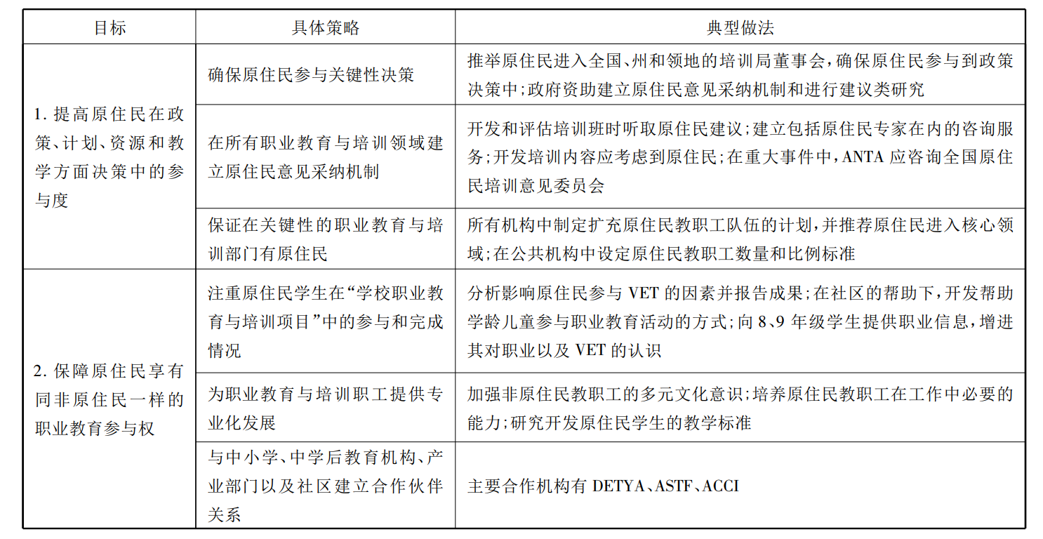 为改善原住民学生的学习成效,提供与原住民文化更为适切的职业教育,帮助原住民顺利就业,为其终身学习创造更负责任的制度,澳政府于2000年推出了首部原住民职业教育与培训专项国家战略———《原住民职业教育与培训国家战略:学习型文化中的伙伴2000-2005》(Partners in a Learning Culture:Australia’s National Aboriginal and Torres Strait Islander strategy for vocational education and training 2000-2005),提出在和谐、平等、公正精神的指导下,向全体澳大利亚人更新和分享原住民文化,建立一个促进社会经济可持续发展的职业教育与培训体系的愿景。该战略提出了四大目标: