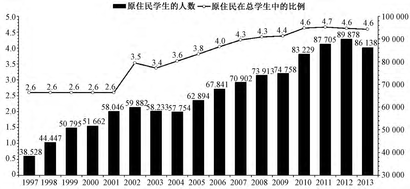 图1 1997-2013年参与VET的原住民学生数及比例