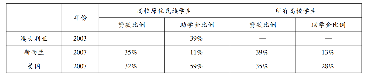 美、澳、新三国对原住民高等教育资助实行的是对原住民族学生和原住民高等教育机构同等资助的模式:一方面对学生施行经济资助和学业上的帮助,另一方面对原住民高等教育机构划拨经费支持其发展。对原住民族学生的资助既有全国性助学金、贷款和奖学金的混合型资助模式,也有对原住民族学生提供额外的经济支持,如原住民专项奖助学金,资助项目多依据原住民族学生的经济需要设定奖(助)学金的具体数额,奖金也较为丰厚,基本上可以满足多数原住民族学生的生活所需。美、澳、新三国对资助的具体受众范围和项目内容各有不同,美国和澳大利亚原住民族学生助学金的覆盖面较大,比例分别达到了39%、59%,新西兰只有11%的学生能够获得助学金的资助。除了对原住民族学生的直接资助之外,美、澳、新三国还特别重视对接收原住民学生高校的资助,如此能够减轻原住民族学生的经济压力。