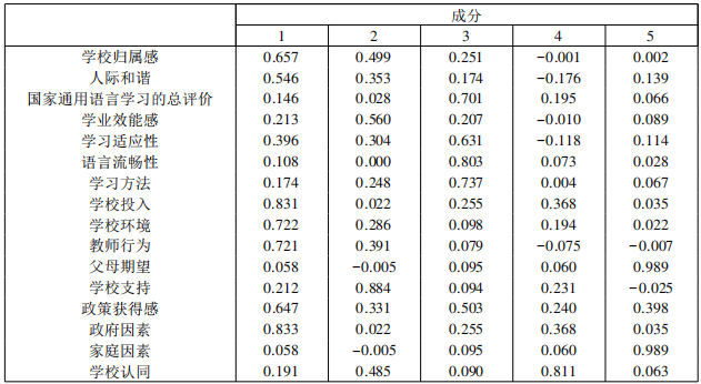 2.学校为国家通用语言教育教学提供了较好支持。因子分析结果显示,“学校投入力度、学校环境和教师行为”三个变量在因子1的载荷分别为0.831、0.722、0.721;“学校支持”变量在因子2的载荷为0.884,说明学校支持力度、学校环境和教师行为都会直接影响学生国家通用语言学习的效果。在调查中,78.3%的受访对象表示学校对于国家通用语言学习会提供必要的支持并开展了相关课外活动,75.4%的受访对象认为教师在国家通用语言课堂教学中积极引导学生学习国家通用语言,很容易理解教师国家通用语言的教学内容,在问到“学校环境是否适合学习国家通用语言”时,75.9%的受访对象认为“符合”或“非常符合”。调查结果显示,学校为推广国家通用语言提供了良好的学习条件。