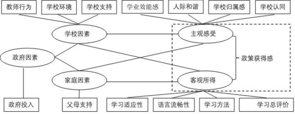 国外与此相关的文献更多地聚焦于“幸福感”的研究[7];国内有关“获得感”的研究成果较多,在获得感的定义上,或将其界定为多元利益主体对自己在某项政策实施过程中实际所得的主观评价[8];或定义为政策所带来的物质利益与基本权益的一种主观体验[9]。借鉴已有研究成果,基于铸牢中华民族共同体意识、推动民族团结进步的政策价值导向和政策意旨,将普及国家通用语言的教育政策获得感的研究维度定为“主观感受和客观所得”两个方面,其中,学生学业效能感、人际和谐、学校归属感和学校认同构成主观感受,学生的学习适应性、语言流畅性、学习方法和国家通用语言学习总评价构成客观所得。此外,政府因素、学校因素及家庭因素三者共同影响着国家通用语言教育政策获得感。据此,可以构建这一政策获得感影响因素的多维测度模型,通过因子分析法提炼影响因子并厘清各个指标与这一政策获得感的深层联系(图1所示)。