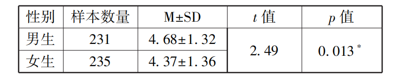 采用独立样本t检验,检验男、女生在思维模式上是否有显著性差异。如表1所示的结果表明:男、女生在思维模式上存在显著性差异(p=0.013<0.05)。相比于女生,男生更倾向于成长型思维模式。本研究得出的结果与已有研究的结论基本一致。[4]因此,研究假设H1成立。
