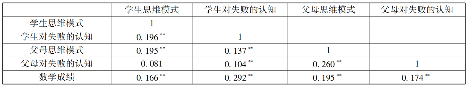 学生思维模式、学生对失败的认知、父母思维模式、父母对失败的认知以及学生数学学业成绩之间的相关性如表3所示。可以看出,学生思维模式与学生数学学业成绩之间是显著相关的(r=0.166,p<0.01),学生思维模式与学生对失败的认知之间(r=0.196,p<0.01)以及学生对失败的认知与学生数学学业成绩之间(r=0.292,p<0.01)都是显著相关的。同时可以看出,虽然父母对失败的认知与学生思维模式之间并没有显著相关性(r=0.081,p>0.01),但是父母思维模式与学生思维模式之间是显著相关的(r=0.195,p<0.01),并且父母思维模式与学生对失败的认知之间(r=0.137,p<0.01)、学生对失败的认知与学生思维模式之间(r=0.196,p<0.01)都是显著相关的。