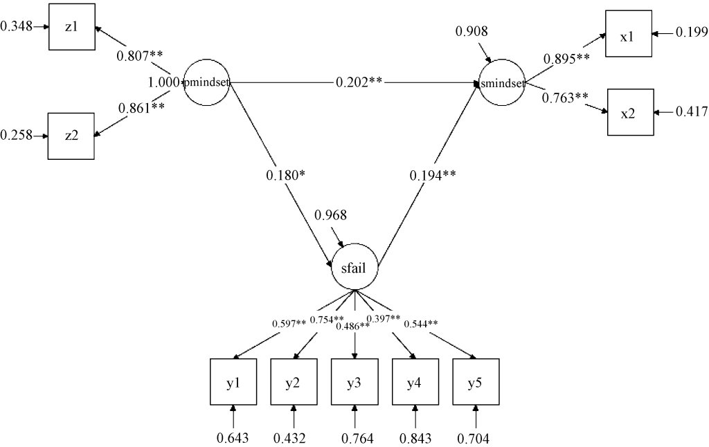 为了进一步考察父母思维模式、学生对失败的认知和学生思维模式的关系,检验学生对失败认知的中介作用,将父母思维模式作为自变量,学生对失败的认知为中介变量,学生思维模式作为因变量,利用Mplus7.0软件建立基于结构方程的中介效应模型(见图2)。